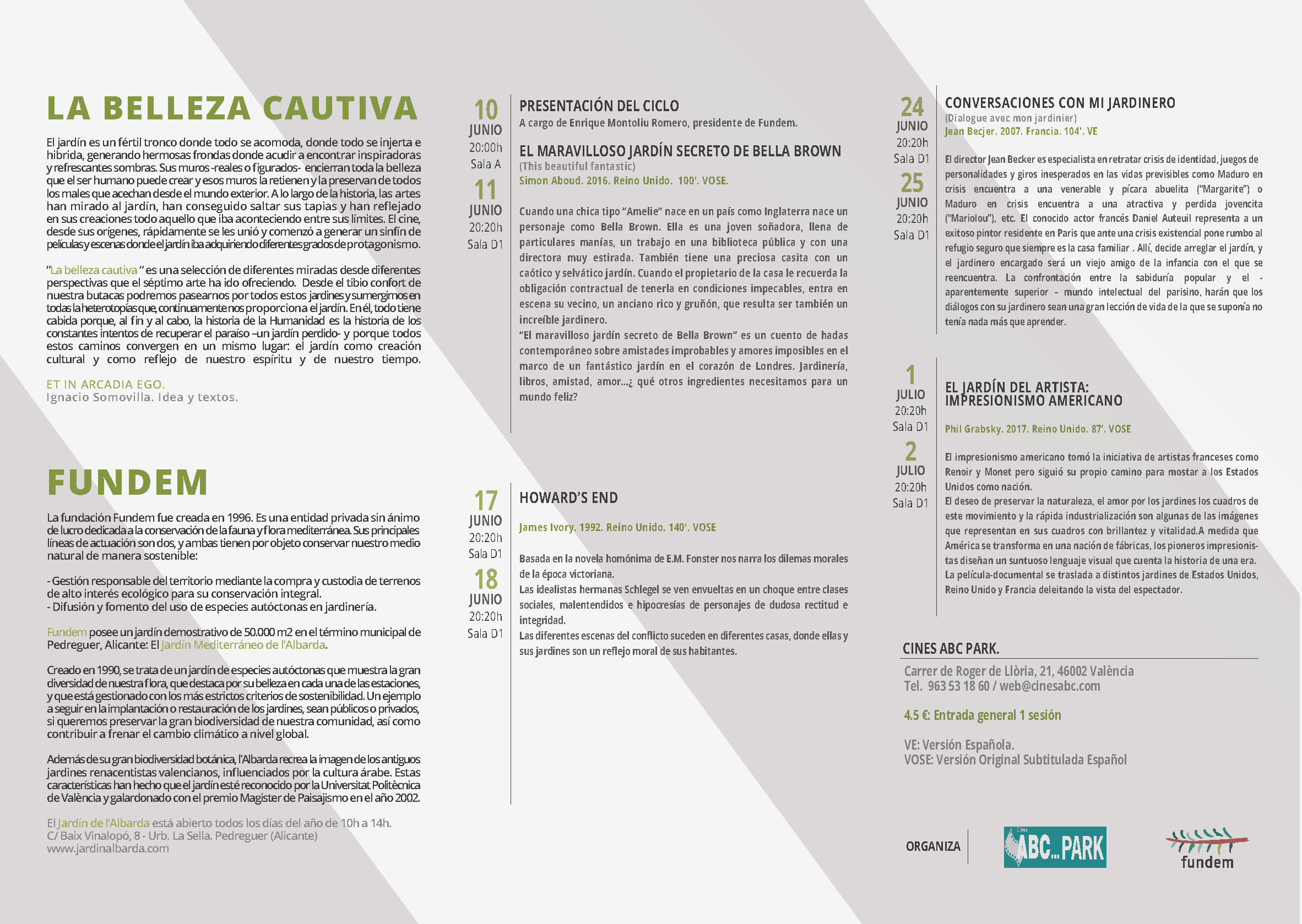 Del 10 de junio al 2 de julio tendrá lugar en los cines ABC Park de Valencia «La Belleza Cautiva» II Ciclo de Cine y Jardín en el que se proyectarán películas donde los jardines forman parte de su trama principal.