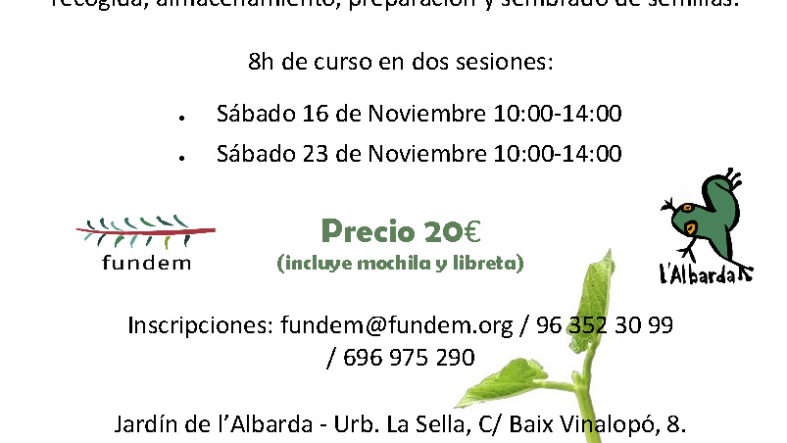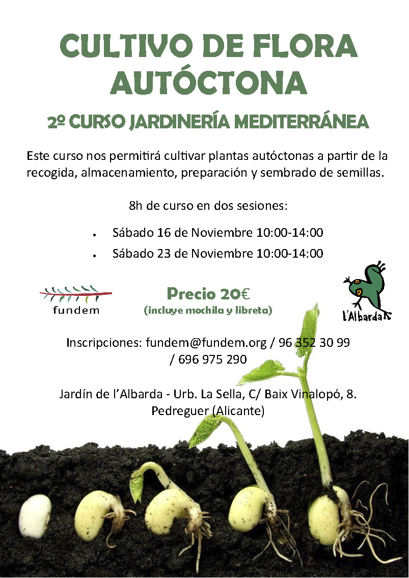 Los sábados 16 y 23 de noviembre, el ambientólogo y guía del Jardín, Ángel Pérez, impartirá el segundo curso de jardinería mediterránea: «Cultivo de flora autóctona», apto para todo el que desee acudir. El pago de la inscripción se realizará el mismo día 16 de noviembre en el propio Jardín.