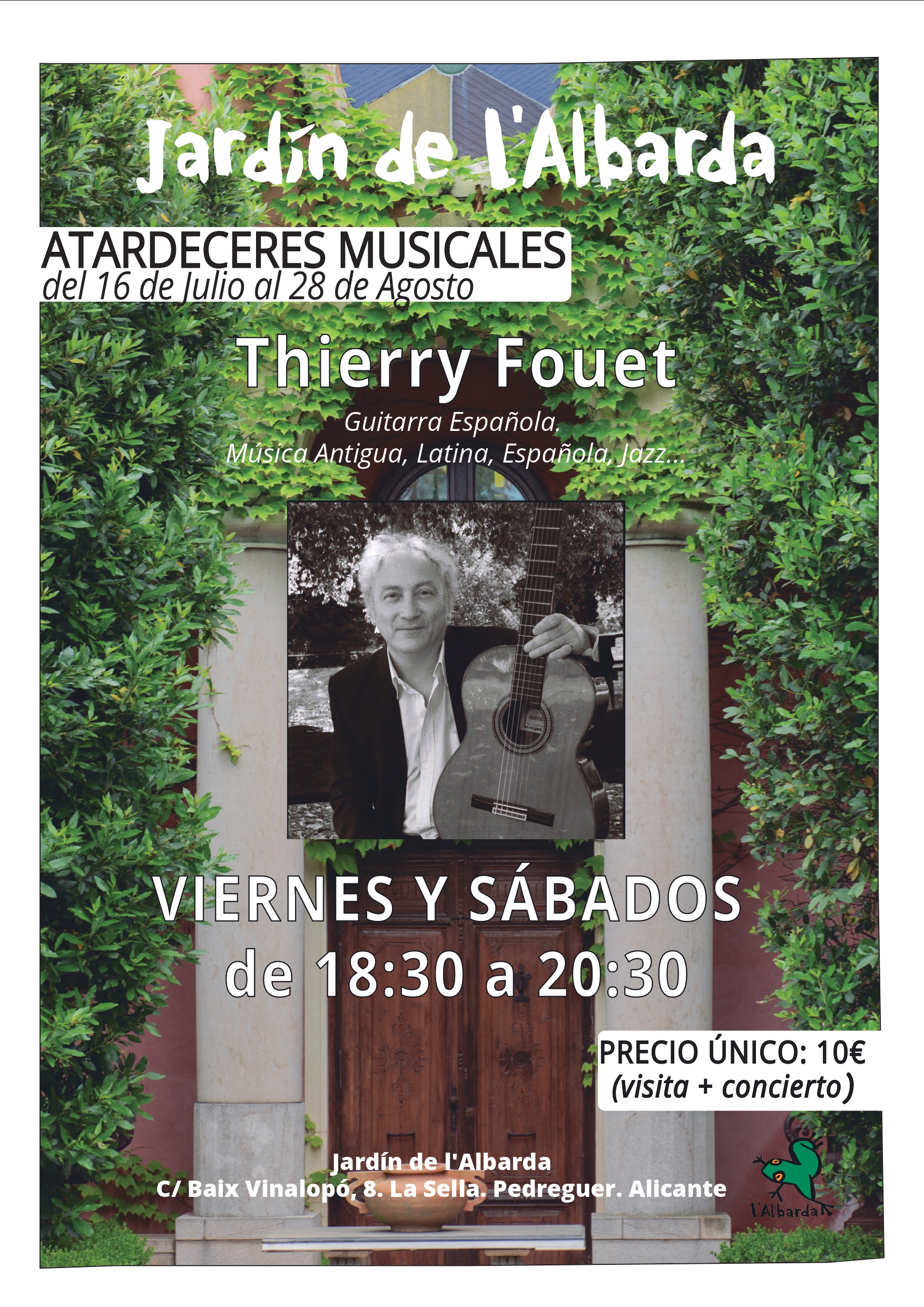 Os informamos de que a partir del 16 de julio, todos los viernes y sábados el jardín de l’Albarda estará ambientado entre las 18:30h a 20:30h con la actuación y la guitarra de Thierry Fouet: