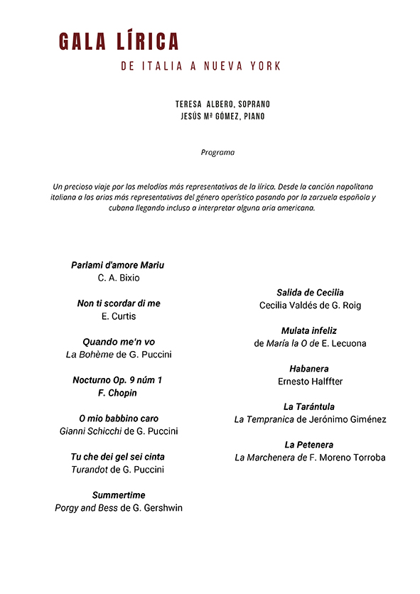 La gala nos llevará en un precioso viaje por las melodías más representativas de la lírica; desde la canción napolitana a las arias más representativas del género operístico, pasando por la zarzuela española y cubana y llegando, incluso, a interpretar alguna aria americana.