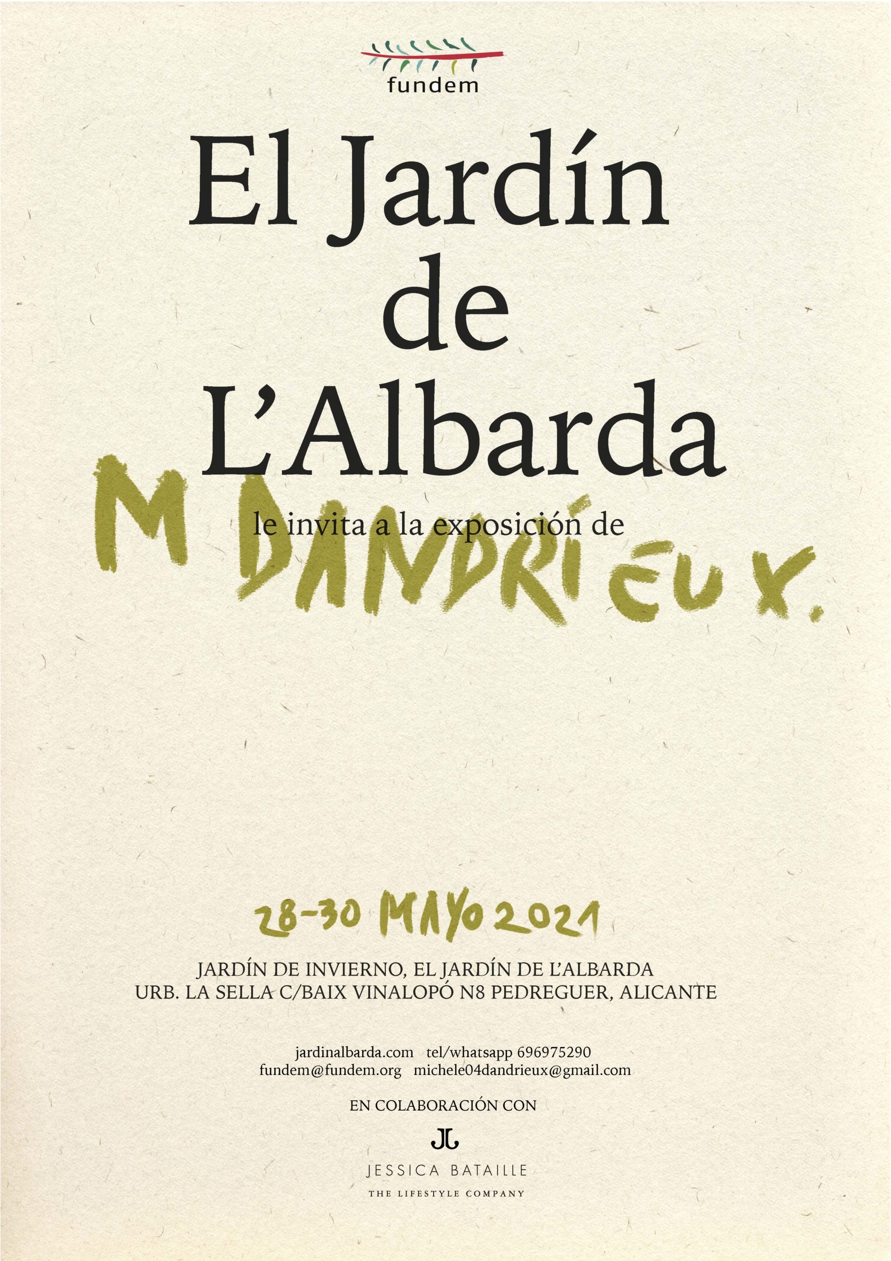 Informamos que durante los días 28, 29 y 30 de mayo tendrá lugar en el Jardín de l’Albarda una exposición de cuadros de la magnífica artista francesa Michele Dandrieux. En ella podremos disfrutar de las numerosas escenas del Jardín de l’Albarda que la artista ha ido elaborando con el tiempo.