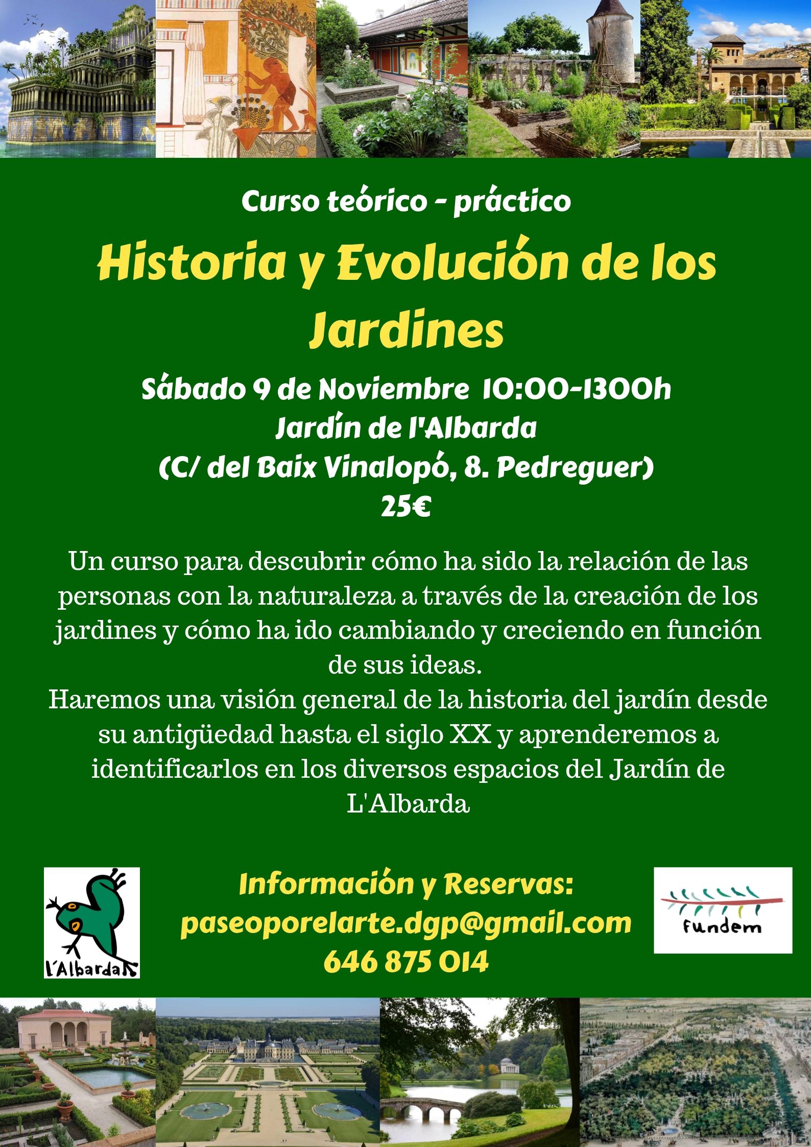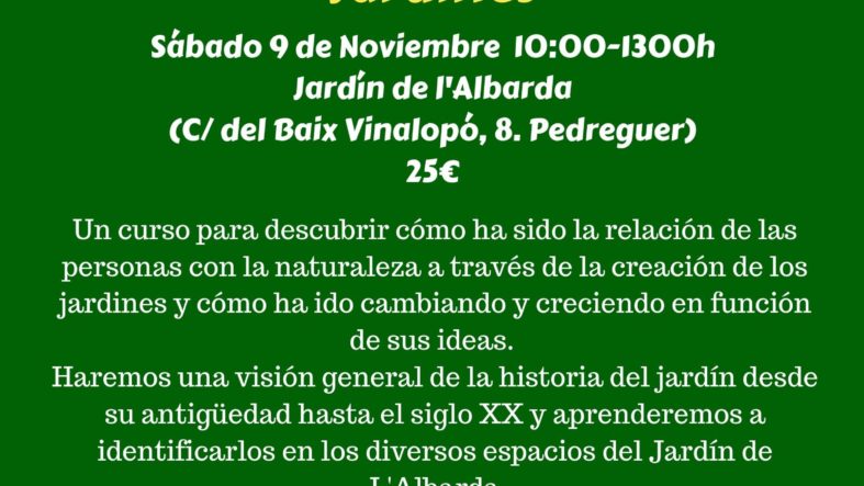 El SÁBADO 9 de NOVIEMBRE, entre las 10:00 y las 13:00 horas, se impartirá en el Jardín de l’Albarda un curso teórico-práctico acerca de la historia y evolución de los jardines.