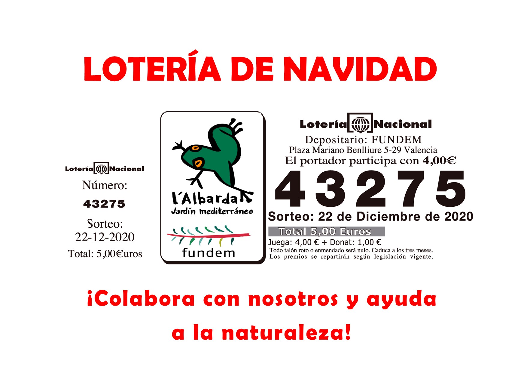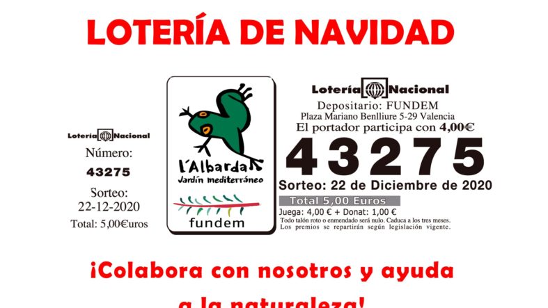 Podéis solicitarnos el número de participaciones que queráis y podréis adquirirlas tanto en el Jardín de l’Albarda (C/ Baix Vinalopó, 8 – La Sella. Pedreguer – Alicante) de lunes a domingo entre las 10:00 y las 14:00 horas, como en las oficinas de Fundem (Pl. Mariano Benlliure, nº 5, pta. 29 – Valencia) de lunes a viernes entre las 9:00 y las 14:00 horas.