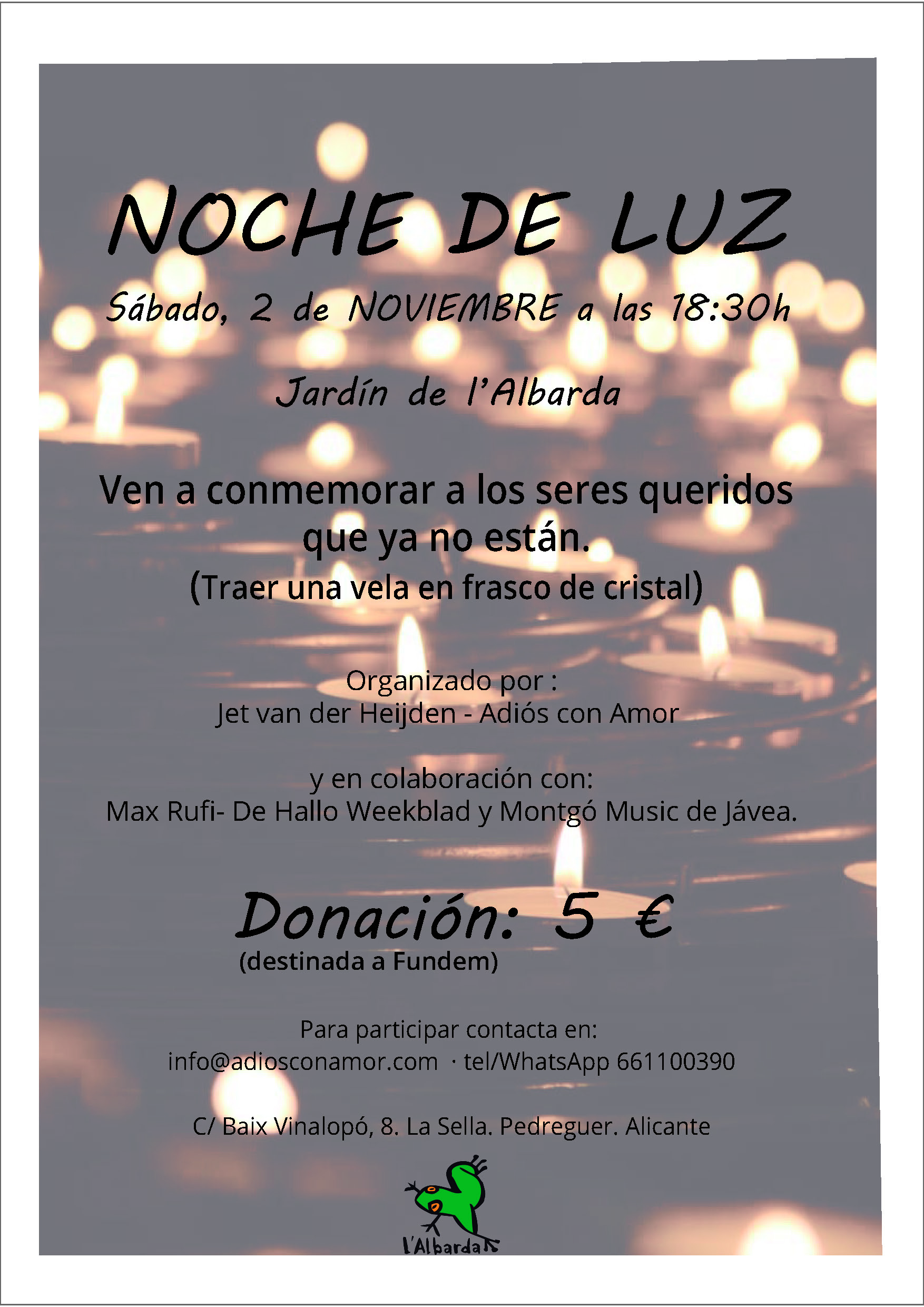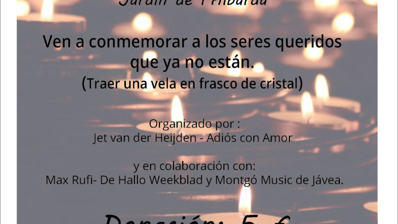 «El 2 de noviembre 2019, Día de todos los Difuntos, celebramos una Noche de Luz para conmemorar a todos nuestros seres queridos que ya no están. A partir de las 18.30 hrs llegada al Jardín de l´Albarda, nos reunimos alrededor de la piscina. A las 19.00 hrs encendemos todos nuestra vela (traer una vela en frasco de cristal y encendedor). Juntos, todos con nuestros recuerdos, nos sentimos abrazados por el calor humano, las luces y la música en vivo.