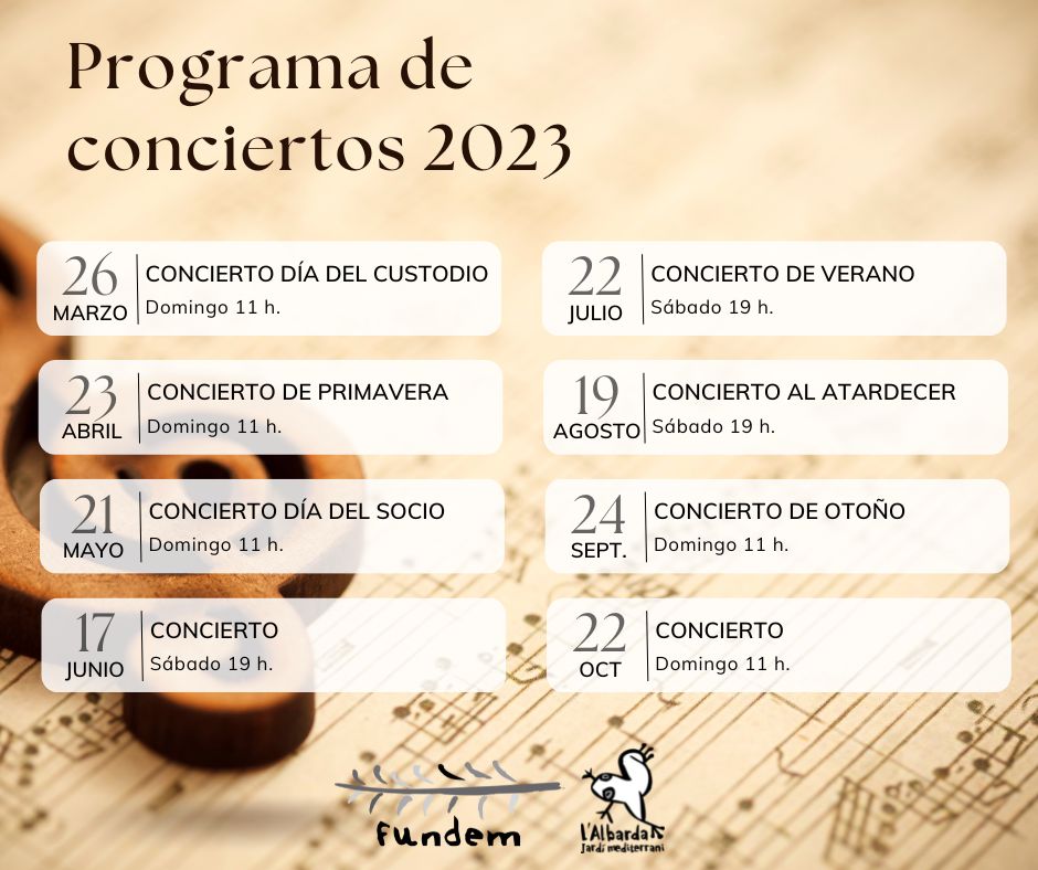 Ya tenemos el programa de conciertos de la temporada🎵, que comenzará el 26 de marzo y concluirá el 22 de octubre. Un concierto al mes en el maravilloso entorno del Jardín de l’Albarda ¿Te lo vas a perder?