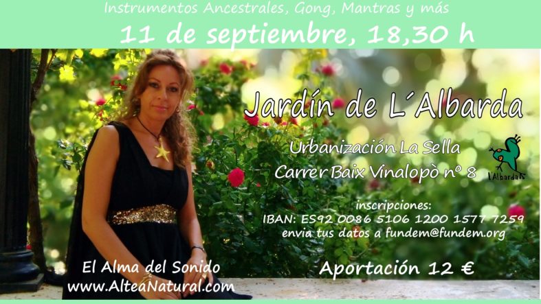 El próximo SÁBADO 11 de SEPTIEMBRE a las 18:30h tendrá lugar en nuestro Jardín de l’Albarda el singular evento «Sonidos del Mundo y Concierto de Mantras» organizado por Gema Rodríguez.